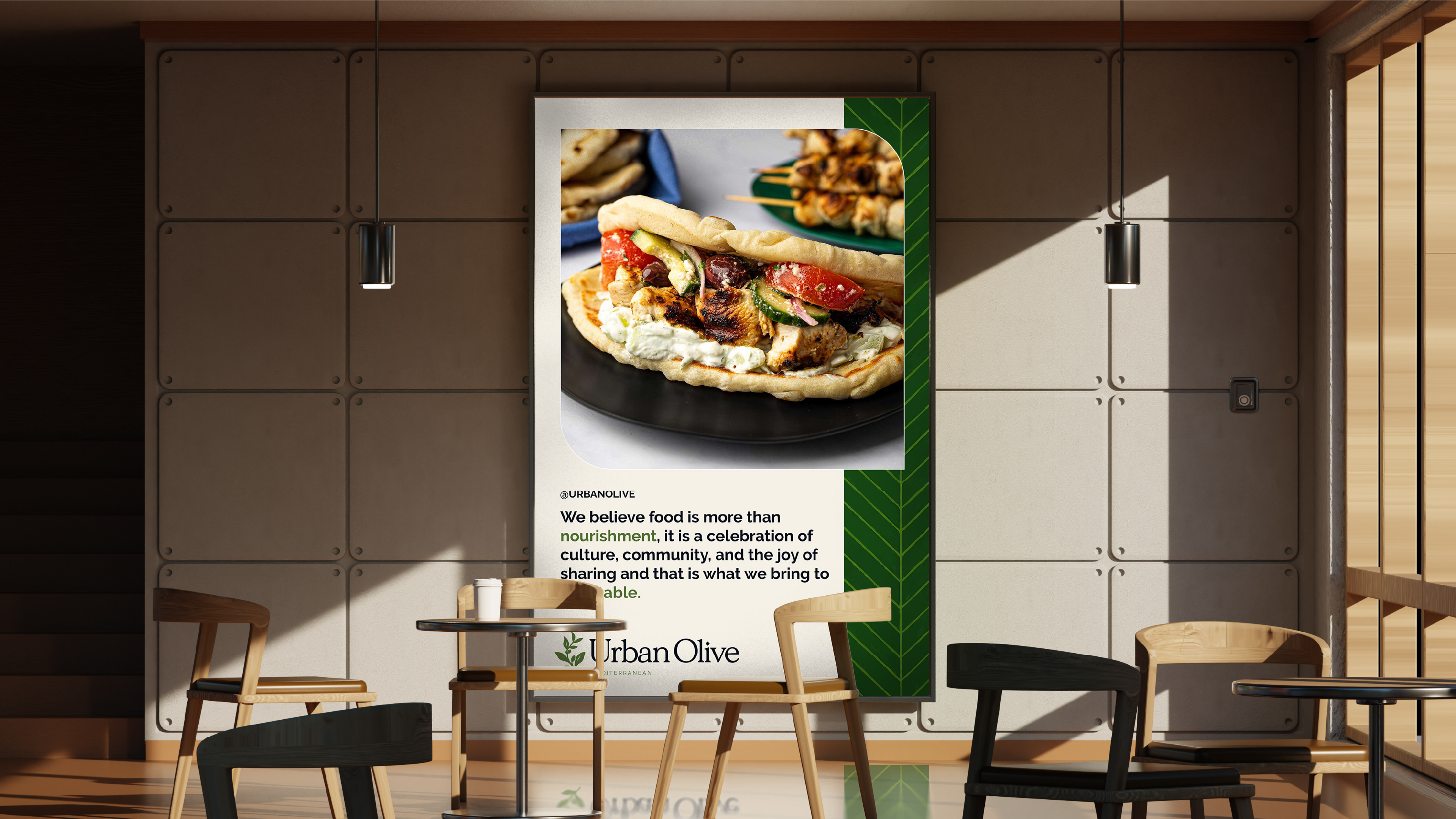 O resultado é uma marca que respira modernidade sem perder suas origens. Uma identidade atemporal e sensorial, que se estende do espaço físico às embalagens, do ambiente digital à experiência à mesa. A Urban Olive Mediterranean não é apenas um lugar para comer, mas um espaço para se reconectar com o essencial — o sabor, as pessoas e o prazer de compartilhar uma ótima refeição.